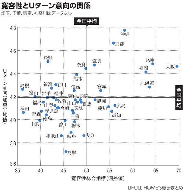 寛容性を横軸に、Uターン意向を縦軸にした場合、沖縄のほか、大阪、兵庫、福岡など大都市を抱えた府県が右上に、山形、秋田、鳥取など人口減少に悩む県が左下に集中しています。地域社会の寛容性は住民をその地域にとどめ、他所へ転出した若者を呼び戻す力を持っています。寛容性とは、地域創生戦略を考える上で重要な指標と考えられます。