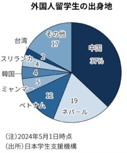 日本学生支援機構の発表によれば、2024年5月1日現在の外国人留学生が前年比21%増の33万6,708人で、比較可能な2011年以来で過去最多となっています。円安などを背景に日本を選ぶ留学生が増えたとみられ、新型コロナウイルス禍前を初めて上回りました。出身国・地域別は、上位10カ国は全てアジア圏で、前年比7%増の中国が最も多く、全体の4割弱を占めています。71%増のネパール、11%増のベトナムが続き、4位のミャンマーは2.1倍に増えています。