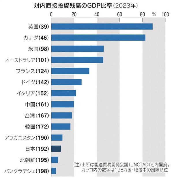 外国企業による日本への投資は対日直接投資と呼ばれます。対日直接投資の2023年末時点の累計額は51兆円で、2000年末の6兆円から8倍以上になっています。投資は着実に拡大していますが、諸外国と比較するとなお世界最低水準です。対日直接投資のGDP比は8.5%ですが、国連貿易開発会議によれば、この比率は198カ国・地域中192位です。