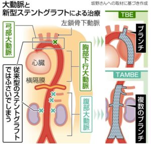 この状況を一変させる新型ステントグラフトが、昨年保険適用されました。それぞれ弓部用(TBE)、胸腹部用(TAMBE)と呼ばれ、予め枝分かれする血管に対応したブランチがついています。これにより、大きく切り開く手術法でなくてもこぶの破裂を防ぐ治療ができるようになりました。かつては手術を諦めざるを得なかった人や、人工血管置換術のリスクが不安な人に大きな福音になります。