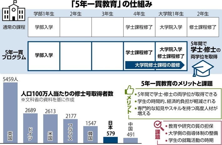 大学の学部と大学院修士課程の5年一貫教育に注目が集まっています。これまでは成績優秀者のみに認められていた特例でしたが、文部科学省が2026年度にも制度化する方針を示しています。学生の選択肢を増やし、社会課題の解決などを担う高度人材を育てる狙いがあります。