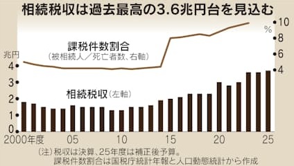 2025年度の相続税収は3.6兆円台と過去最高を更新する見通しです。基礎控除が縮小される前の2013年度に比べて2.3倍に増えています。2015年に課税対象が広がった上、近年は都市部の地価上昇、少子化によるきょうだいの減少も税収を押し上げています。負担の裾野は徐々に広がっており、大相続時代が到来しつつあります。