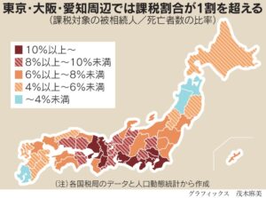 国税庁のデータによれば、相続税が生じた人は2023年度で9.9%と10人に1人程度です。必ずしも人が亡くなった時に誰もが払う税金ではないものの、2013年度の4.3%からみると倍増しています。特に都市部で増えています。日本総合研究所の試算では、1年間に国内で相続される資産は足元で46兆円程度になります。高齢化により死亡者数が増加するため、この金額は2030年に48.8兆円、2040年に51.0兆円に増えることになります。