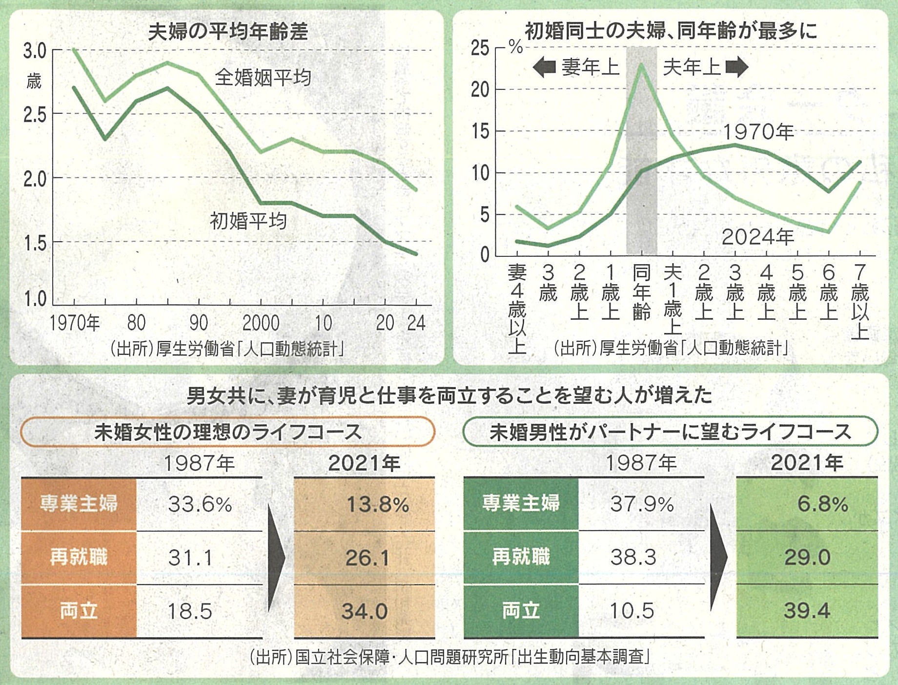 国立社会保障・人口問題研究所の出生動向基本調査によれば、理想とする女性のライフコースとして、出産後も仕事を続ける両立と答えた未婚の男女の比率が、出産後に再び働く再就職の比率を2021年に初めて上回っています。かつては収入の少ない若い女性が、経済的安定を求めて年上の男性と結婚し、専業主婦になる傾向がありました。しかし、収入の伸び悩みが長期化し、女性が専業主婦になるリスクが顕在化しています。