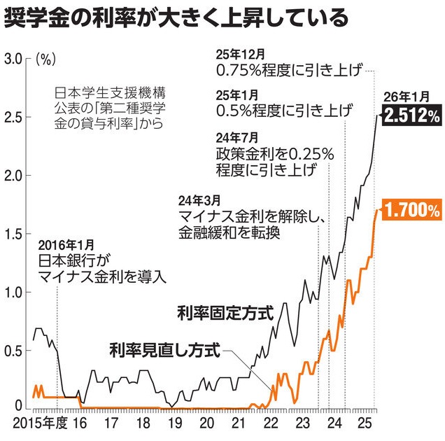 利率は日本銀行の金融緩和策で長年低率でしたが、2023年頃から急上昇しています。返す期間中の金利が変わらない利率固定方式でみると、2022年3月の約0.4%から、2025年3月に約1.6%、2026年1月は約2.5%に上昇しています。返還利率は、卒業時など貸与を終えた時の値が上限3%で適用されます。