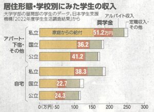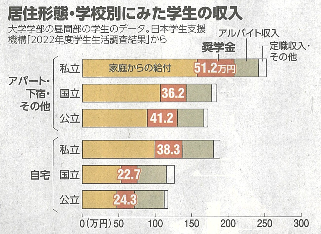 生活費が上がり、奨学金は学生の大きな助けになります。機構の調査によれば、自宅外から私立大学に通う学生は平均で年51万円を借りていて収入の2割を占めています。自分の負担する利率は入学時など借り始めた時には分からず、卒業時など借り終えた時に決まります。当初に予期しなかった高い利率での返還も後から決まることになります。