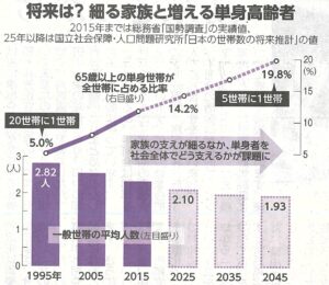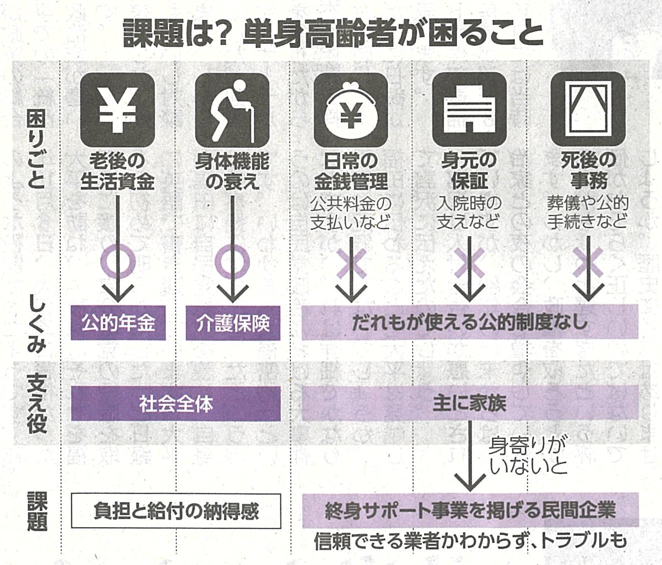 65歳以上の単身世帯の比率は1995年に5%でしたが、2025年は14%、2045年に20%になる見込みです。厚生労働省の地域共生社会の在り方検討会議は、身寄りのない高齢者らへの対応を掲げています。行政の相談窓口体制の強化に加え、死後事務の支援などを新たな福祉事業として法律に位置づけ、多様な経営主体がかかわれるようにする必要があるとしています。