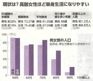 平均寿命は男性81歳、女性87歳、死亡者が最も多い年齢は男性88歳、女性92歳です。50代まで男女ほぼ同数の人口は、70代で122万人、80代で209万人も女性が多くなります。女性は男性より高齢期に単身になりやすい状況にあります。老後資金は公的年金で備えられ、体の機能が衰えると介護保険制度を使えます。保険料支援の重さや給付の不十分さなどは問題ですが、社会全体で支え合う仕組みがあります。一方で身元の保証や死後の事務は、身寄りがいないとサポート態勢を築きにくい状況です。