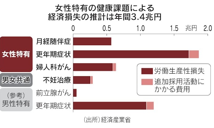女性の就業者数や就労年数が増え、女性の健康は企業の経営課題としても重要度を増しています。経済産業省の2024年の試算では、月経に伴う症状や更年期症状など女性特有の健康課題による経済損失は年間約3.4兆円に達するとされています。男性特有の健康課題(更年期症状や前立腺がん)の約1.2兆円を大きく上回っています。