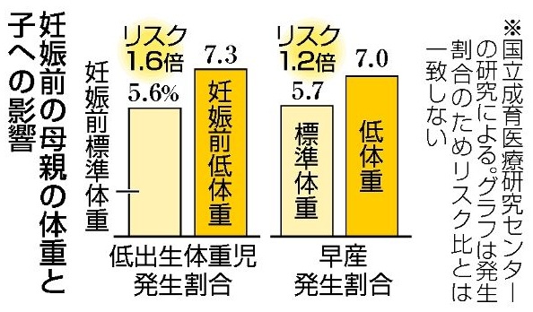 20~30代の日本人女性の約2割が低体重で、背景には痩せていることが美しいという意識や文化があります。子が低体重で生まれると、感染症が重症化しやすく、成人後の生活習慣病や心筋梗塞のリスクも高まります。