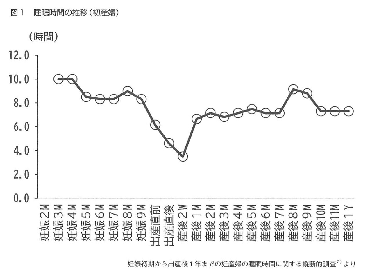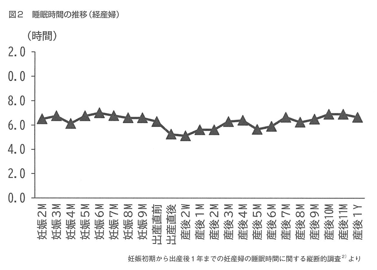 妊産婦の総睡眠時間は、初産婦では、出産直後から出産2週間までは総睡眠時間は3~4時間とかなり少ない傾向にありますが、その時期以外は、6~10時間の睡眠がとれています。既に子どもがいる経産婦でも、出産直後から出産2週間までは、総睡眠時間は5時間程度とやや少ない傾向にありました。経産婦は、出産直後から出産後2週間を除いても、妊娠期から出産後1年までを通して、総睡眠時間は6時間程度と少ない傾向にあります。