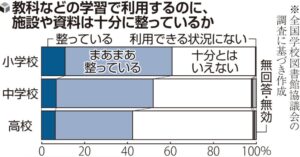 全国学校図書館協議会の調査によれば、授業などで学校図書館を利用する際に、施設や資料が十分に整っていないと考える学校は、中学校の約5割、高校の約6割に上っています。予算不足などで必要な本を揃えられず、学習に活用しにくい状況になっています。