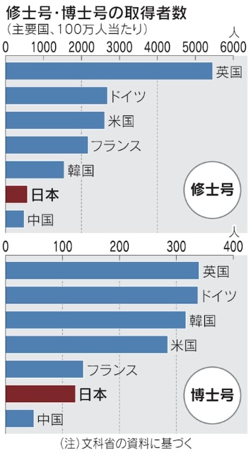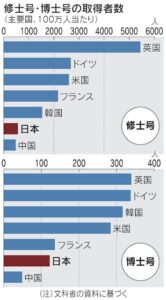 制度改正の背景には、修士号取得者の少なさがあります。文部科学省の2023年の資料によると人口100万人あたりの修士号取得者数は579人で、英国やドイツなどを下回っています。特に文系で課題となっています。大学院などへの進学率は、理学や工学が4~5割で上昇傾向にある一方、人文科学と社会科学は5%以下にとどまっています。
