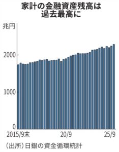 日銀の資金循環統計によれば、9月末時点で家計の金融資産残高は2,286兆円と2四半期連続で過去最高でした。前年同期と比べて4.9%増えており、伸び率は2025年4~6月期の1.1%増から拡大しています。