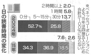 ベネッセコーポレーションの調査によれば、小中高生の52.7%が読書をしないと回答しています。2015年調査時の34.3%から約1.5倍に増えています。一方、スマートフォンの使用時間は延びており、長いほど本を読む時間が短くなる傾向がみられています。