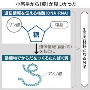 地球に落ちてきた隕石からは、生命の材料分子でDNAやRNAをつくる核酸塩基や糖、たんぱく質をつくるアミノ酸が見つかっており、宇宙から地球に生命の材料がもたらされたという説がありました。NASAの研究チームは、2025年に核酸塩基やアミノ酸などの有機物をベンヌの試料から発見したと発表していました。しかし、糖は見つかっていませんでした。