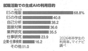 就職情報サービスのマイナビの調査によれば、就職活動でAIを利用したことがあると回答した学生は67%に上っています。目的はエントリーシートの推敲が69%で最多で、次いでエントリーシートの作成が41%でした。