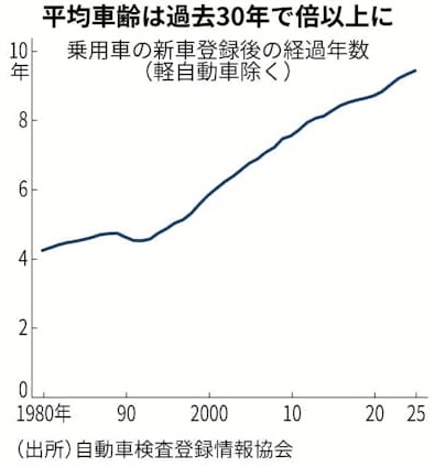 自動車の平均車齢が上がり続けています。2025年は9.44歳と、33年連続で上昇して10歳に迫りつつあります。耐久性の向上や中古市場の活性化などが背景にあります。自動車は日本の基幹産業で、政府は従来補助金などの支援策は新車向けを手厚くしてきました。長寿化が進めば政策の見直しが必要になります。