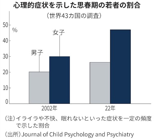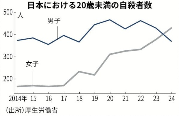 厚生労働省の集計によれば、日本では、2024年に20歳未満の女子の自殺者数が430人で、男子の373人を初めて上回りました。10年前は女子が165人、男子が373人であり、長く続いた傾向が逆移しました。男子の自殺者数が横ばいである一方、女子の自殺者数だけが2.6倍に増えています。女子のメンタルヘルスの悪化は世界規模の研究でも確認されています。43カ国の120万人以上の調査では、この20年でメンタルヘルスの男女差が広がっており、女子の悪化は男子を大きく上回っています。男女ともに思春期を通じて抑うつや不安の症状が増え、特に女子でこの傾向が顕著です。