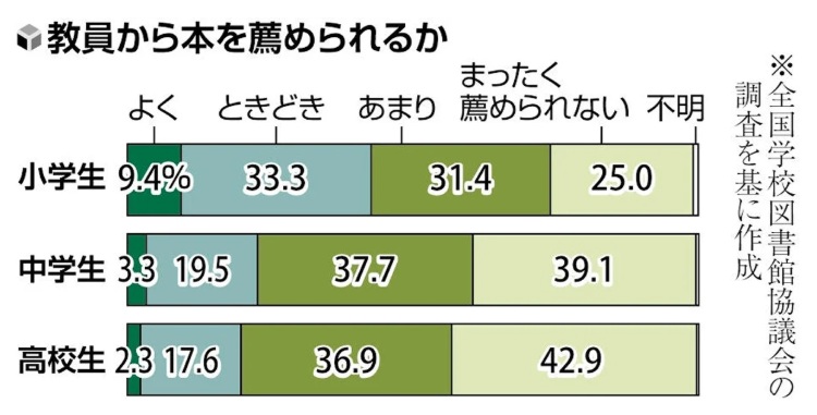 2019年の調査結果と比べると、本を薦められることのない小学生は5ポイント減少しましたが、中学生は5ポイント増、高校生は3ポイント増でした。中高生で割合が高い理由は、小学校と違って教科ごとに教員が変わり、国語以外の授業では本を薦められる機会が少ないためとみられます。