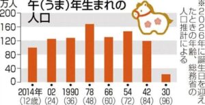 年男・年女に当たる午年生まれは940万人で、十二支別に見ると最も少なくなっています。午年生まれの男性は456万人、女性は484万人です。生まれた年で見ると、1978年生まれで48歳となる人が168万人と最も多く、1954年生まれの72歳が147万人です。