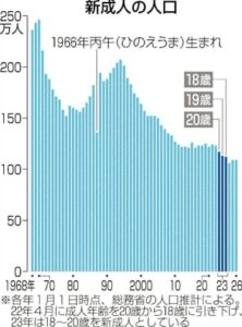 総務省公表の2026年1月1日時点の人口推計によれば、2007年生まれの新成人(18歳)は109万人でした。1968年以来最少だった2024年の106万人に次ぎ2番目に少なく、少子化の流れが続いています。新成人人口は、第1次ベビーブー世代の1947~1949年生まれが成人した直後の1970年に246万人と最多を記録しました。第2次ベビーブーム世代の1971~1974年生まれが成人した1990年代前半には、200万人台と2回目の山を迎えましたが、その後は減少傾向が続いています。