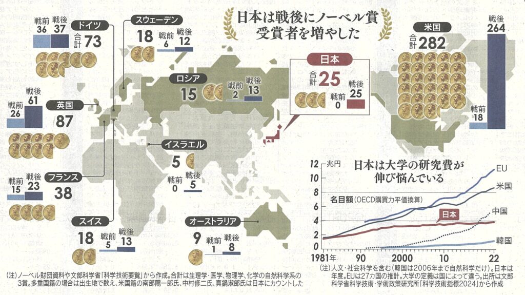 戦後に始まった日本のノーベル賞受賞は、経済発展に伴って様相が変わってきます。理論中心から、高度な装置を使った物理実験や合成化学の受賞も増えました。2000年以降、日本の科学者による受賞が続き量産時代に入りました。生理学・医学、物理学、化学の自然科学系の受賞者は25人に達しています。21世紀以降に限れば19人と、科学技術超大国の米国に次いでおり、日本の研究水準の高さを示すものです。