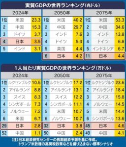 日本経済研究センターの長期経済予測によれば、実質GDPの世界ランキング(83カ国・地域)を試算すると、日本は2024年の4位から、2075年には11位に後退するとされています。1人当たりの実質GDPでは、29位から45位に順位を下げ、中位グループに埋没する結果となります。AIの普及や移民の拡大、雇用制度の見直しなどに取り組み、とりわけ労働力人口1人当たりの生産性を引き上げる努力が必須となります。