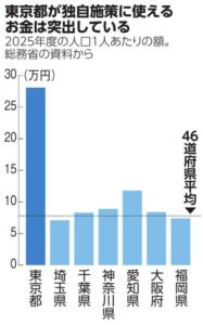 総務省によれば、都が独自施策に充てられるお金は、住民1人あたり28.1万円であり、他の道府県の平均7.8万円と比べて3.6倍にのぼっています。47都道府県で唯一、人口や面積などに応じて政府が算出する標準的な経費を大きく上回る巨額の税収があるためです。