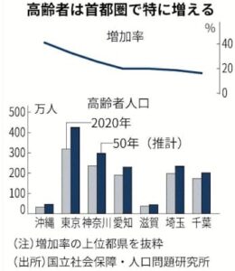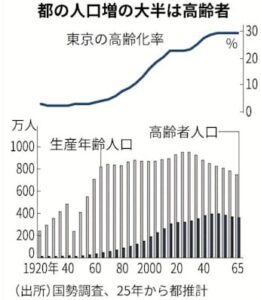 人口増が続く東京都では、高齢者の増加が急ピッチで進んでいます。都の人口は、2020年までの30年間で約220万人増えましたが、9割が高齢者です。子育て世代が他県に転出する一方、介護が必要な年齢になると都内志向が強まる傾向にあります。