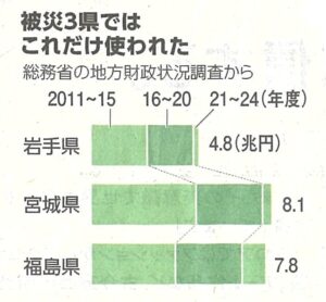 使い道は、防潮堤や高台移転などの住宅再建・復興まちづくりが約13.5兆円と最多で、産業・なりわいの再生は約4.5兆円です。生活支援などの被災者支援は約2.3兆円と全体の1割弱です。原子力災害からの復興だけは減少幅が小さく、前年より増えた年度もあります。原発事故からの復興の難しさも映し出しています。