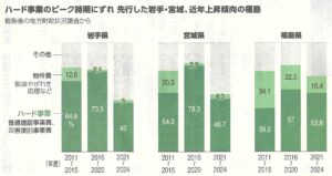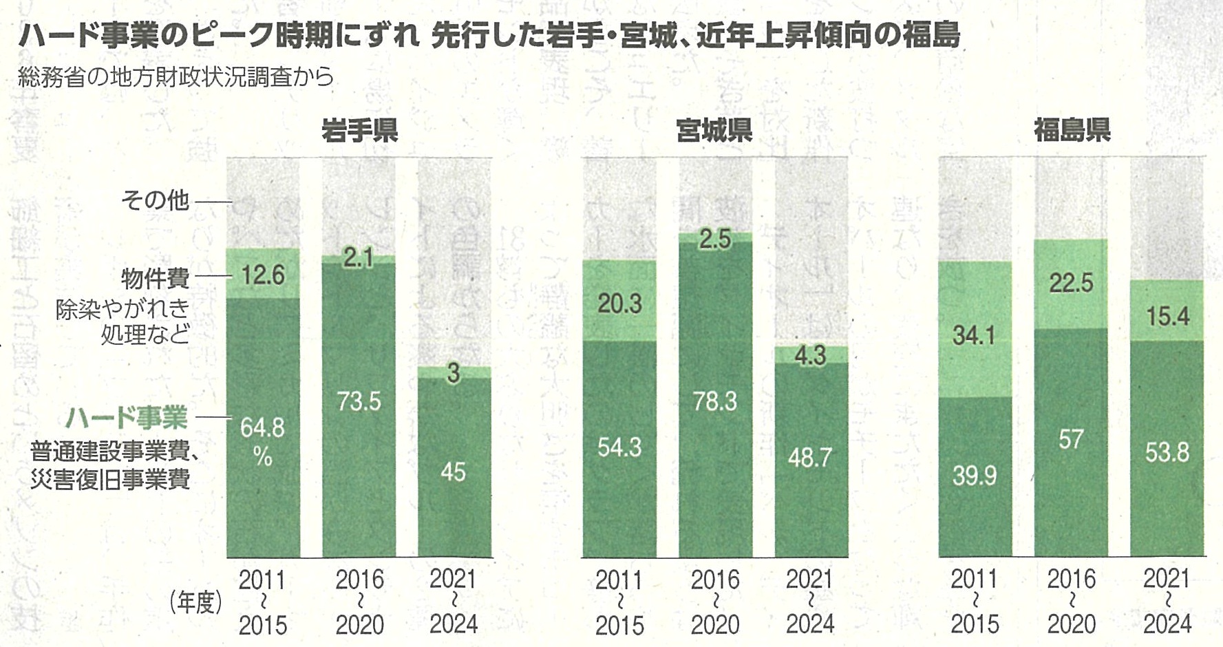 福島はこれまで、両県と比べハード事業の割合が低く、原発事故に伴う避難指示が長引き、まちの再建が遅れました。一方、物件費に区分されるがれき処理や除染など原発事故への支出割合が大きくなっています。