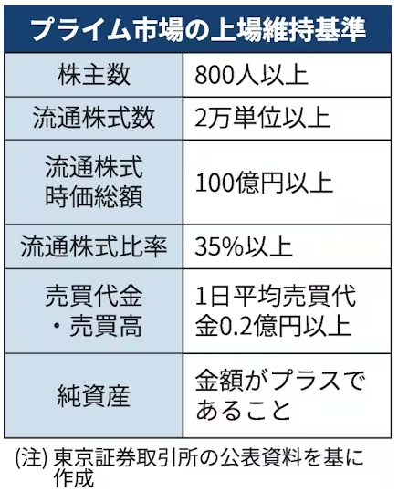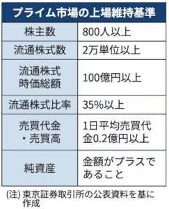 市場区分の再編でできたプライムは最上位の市場で、上場維持基準が従来の東証1部より厳しくなりました。一般投資家が市場で売買できる流通株の時価総額で100億円、流通株式比率で35%が必要となりました。