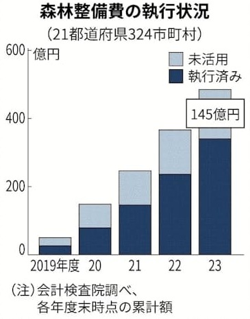 国は、間伐や植林、林業人材の育成といった森林整備事業に充てる原資として、2019年度から森林環境譲与税を都道府県と市町村に交付しています。国が地方自治体に交付した森林整備費の活用が進んでいません。会計検査院の調査によれば、配分された額を使い切れていなかった自治体は調査対象の9割を占め、未活用分は計145億円に上っています。