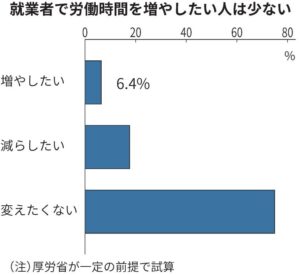 厚生労働省の試算によれば、就業者全体のうち就業時間を増やしたいは6.4%に過ぎませんでした。変えたくないが74.9%と減らしたいが17.6%で、合わせて全体の9割以上を占めています。増やしたい労働者の約半分にあたる3.3%は、契約で決まっている労働時間が週35時間未満かつ年収が200万円未満でした。パートやアルバイトで働く女性を中心に、いわゆる年収の壁を気にせずに働きたい層が多いと思われます。