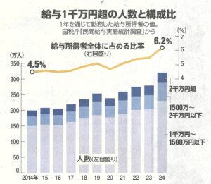国税庁の民間給与実態統計調査によれば、1年を通じて勤務した給与所得者は2024年に5,137万人です。うち年間の給料や手当、賞与の合計が1千万円超の人は男性286万人、女性34万人の計320万人で、全体に占める比率は6.2%です。1千万円超の人を男女別でみると、大半の業種は男性が8~9割超です。これに対して医療・福祉は女性が3割近くを占めています。