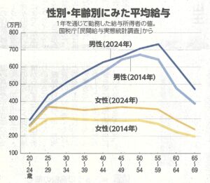 全業種の平均給与を年齢別でみると、男性は50代まで右肩上がりとなる年功序列型がくっきりと表れる一方で、女性は全年代で横ばいです。2024年を2014年と比べると、男女ともに底上げされています。しかし、男性の40代後半~50代前半は、他の年代より伸びの低さが際立っています。企業側は、転職の活発な30~40代前半と、65歳への定年引き上げに伴う対応として50代後半~60代前半を中心に、重点的に処遇改善している可能性があります。
