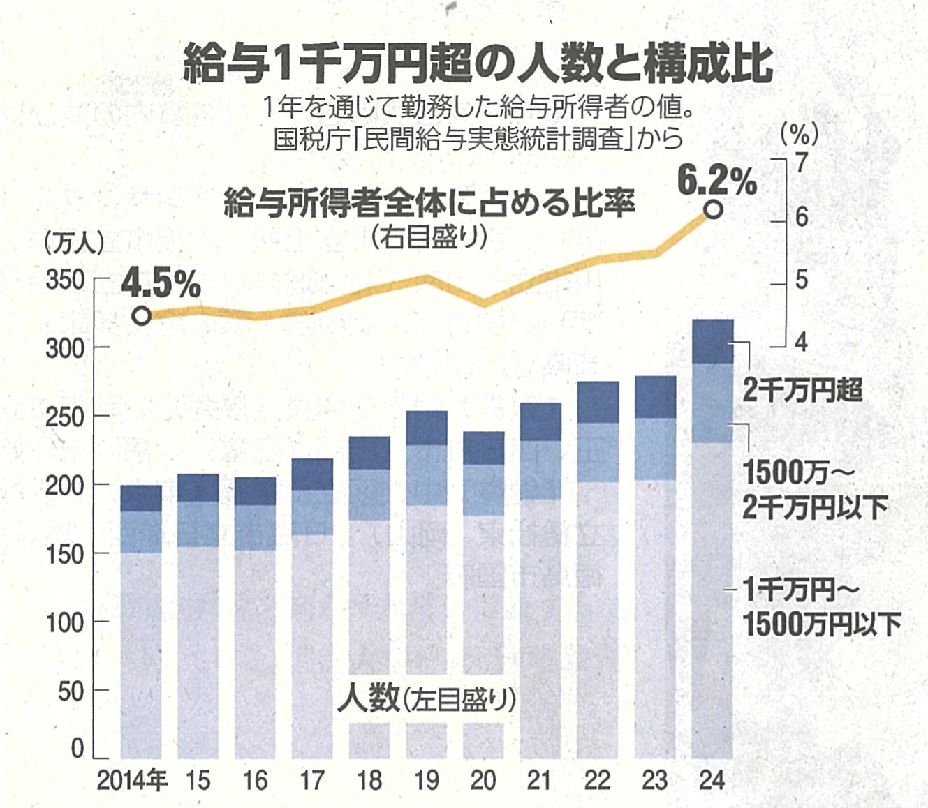 国税庁の民間給与実態統計調査によれば、1年を通じて勤務した給与所得者は2024年に5,137万人です。うち年間の給料や手当、賞与の合計が1千万円超の人は男性286万人、女性34万人の計320万人で、全体に占める比率は6.2%です。1千万円超の人を男女別でみると、大半の業種は男性が8~9割超です。これに対して医療・福祉は女性が3割近くを占めています。