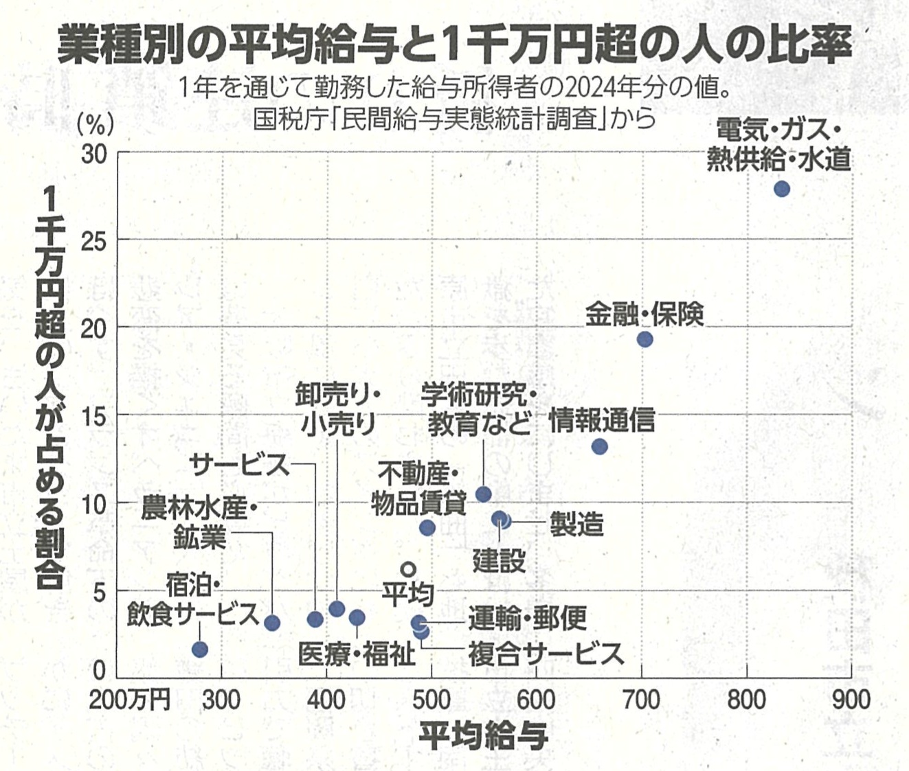1千万円超の人が占める比率を14業種別にみると、電気・ガス・熱供給・水道は働き手の28%と最も多く、平均給与も832万円と最も高くなっています。次いで金融・保険、情報通信の比率が多くなっています。一方で宿泊・飲食サービス、郵便局や協同組合などの複合サービスは3%未満でした。機械化やシステム化を進めやすい業種は高水準で、労働集約型のサービス業などが低い傾向がみられます。