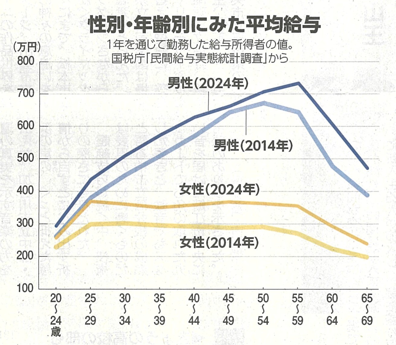 全業種の平均給与を年齢別でみると、男性は50代まで右肩上がりとなる年功序列型がくっきりと表れる一方で、女性は全年代で横ばいです。2024年を2014年と比べると、男女ともに底上げされています。しかし、男性の40代後半~50代前半は、他の年代より伸びの低さが際立っています。企業側は、転職の活発な30~40代前半と、65歳への定年引き上げに伴う対応として50代後半~60代前半を中心に、重点的に処遇改善している可能性があります。