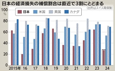 日本の災害への備えは十分ではありません。再保険大手のスイス再保険によれば、1月に能登半島での大地震があった2024年に保険で補償できた経済損失は27%にとどまっています。米国の54%や英国の71%といった主要国より補償範囲が狭く、被災地の経済復旧の妨げとなっています。日本の損害保険の普及率も低く、スイス再保険によれば、GDPに対する損害保険料の割合は2024年時点で2.0%と主要国を大きく下回っています。