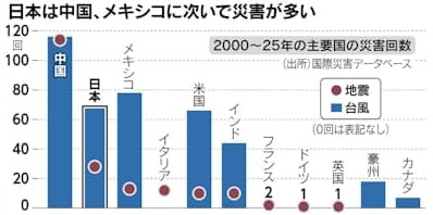 国土交通省によれば、日本の災害は増加傾向にあります。日本は2000~2025年に28回の地震があり、米国の10回の3倍です。台風も69回と他の主要先進国より多くなっています。地球温暖化を背景に災害被害の激甚化・頻発化の傾向は続きそうです。