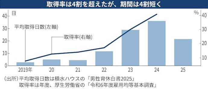 厚生労働省によれば、男性の育休取得率は2024年度に40.5%と2022年度の17.1%から急増しています。積水ハウスの男性育休白書2025によれば、2025年の平均取得日数は21.5日で、前年より4割短くなっています。2023年4月から一定規模の企業は取得率の公表が義務となり、少ない日数でも取得させたい企業の姿勢が反映されています。