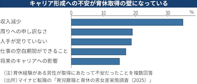 育休を取る男性が初めて4割台となる一方で、キャリア形成への不安が課題となっています。マイナビ転職の調査によれば、男性が育休を取る際の不安は、収入減少が35%と最多で、周りへの申し訳なさが19%などが続きます。しかし、仕事の空白期間ができることが17%、将来のキャリアへの影響が15%という答えも多く、この10年ほどで取得率が急上昇したため、周囲にロールモデルとなる人が少ないことも一因となっています。