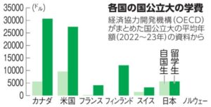 米国や英国の有力大学では、留学生の学費は国内学生より高額です。英国のケンブリッジ大は、国内学生の年9,535ポンド(約200万円)に対し、留学生は2万7,024~7万554ポンド(約560万~約1,470万円)です。OECDの資料によれば、18カ国の国公立大の学費で差が無いのは、日本、イタリア、ドイツ、ノルウェー、スペインだけです。その他の国では、留学生は2~16倍高くなっています。物価水準を考慮してドル換算した金額でみると、フランスが最大の16倍、価格差はカナダが最大で5.5倍でした。