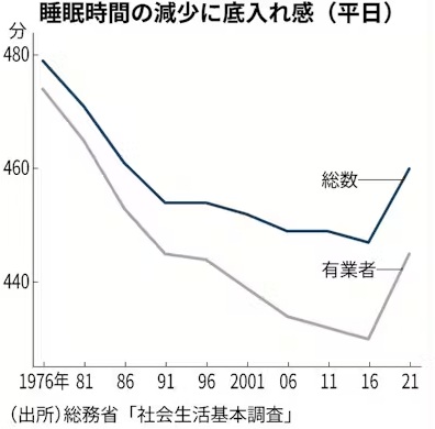 国も危機感を持っており、厚生労働省は2024年に健康づくりのための睡眠ガイドをまとめています。1976年から始まった社会生活基本調査によれば、ほぼ一貫して減り続けてきた睡眠時間が足元で底打ちし、2021年は平日で2016年に比べ13分延びています。有業者だけでみても15分延びました。子どもがいる共働き夫婦の睡眠時間も男女ともに増えています。