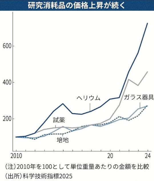 物価高で大学などの実質的な研究費が目減りしています。文部科学省の調査によれば、実験などに使う消耗品の価格は2010年に比べて数倍に高騰しています。政府の財政難で研究費は増えにくい状況にあり、研究現場では高額な消耗品を再利用する取り組みも進んでいます。