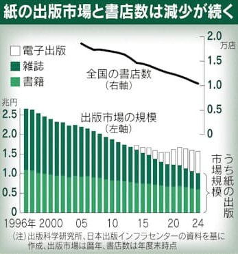 出版科学研究所によれば、2024年の書籍と雑誌を合わせた紙の出版市場は2019年比19%減の1兆56億円でした。ピークの1996年と比べると、4割以下になっています。少子化などで紙の出版市場は今後も縮小する公算が大きくなっています。