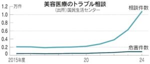 国民生活センターによれば、美容医療に関する相談は2024年度には過去最多の1万737件となり、約10年で5倍に増えています。後遺症などの相談も倍増しています。専用の救急外来を設けて、美容クリニックと緊急時の連携を行う動きもありますが、自由診療の後遺症などの患者を受け入れる医療機関は多くありません。