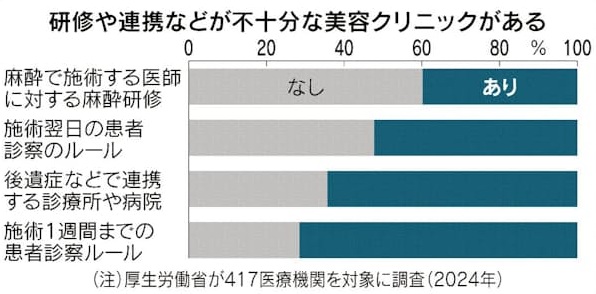 厚生労働省の調査によれば、麻酔で施術する医師への研修がない美容クリニックは約6割を占めています。施術後の診察ルールがないケースも多く、3割超は後遺症などが起きた際に連携する医療機関はみられません。合併症による救急の受け入れ先を見つけるのは困難で、事前に連携する体制づくりが急務です。